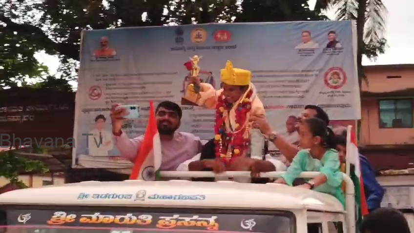 ಹೊನ್ನಾವರ : ಮಲೇಷ್ಯಾದಲ್ಲಿ ನಡೆದ ಅಂತರಾಷ್ಟ್ರೀಯ ಮಟ್ಟದ ಏಷ್ಯನ್ ಪೆಸಿಫಿಕ್ ಯೋಗಾಸನ ಸ್ಪರ್ಧೆಯಲ್ಲಿ ಮೂರನೇ ಸ್ಥಾನ ಪಡೆದು ಕಂಚಿನ ಪದಕ ಗಳಿಸಿದ ಬಾಲಕ ಮಾಣಿಕ್ಯ ಸುಬ್ರಾಯ್ ಗೌಡ ಅವರನ್ನು ಹೊನ್ನಾವರ ಪಟ್ಟಣದ ಶರಾವತಿ ವೃತ್ತದಲ್ಲಿ ವಿಜೃಂಭಣೆಯಿAದ ಸ್ವಾಗತಿಸಿದರು.