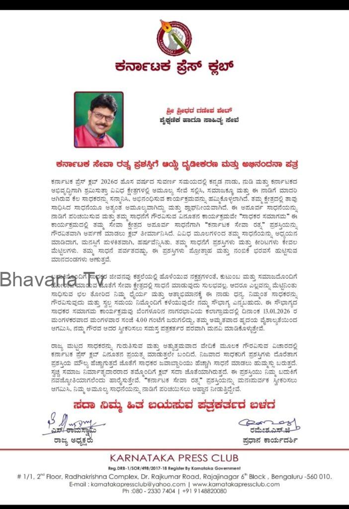 ಕರ್ನಾಟಕ ಪ್ರೆಸ್ ಕ್ಲಬ್ 2026ರ ಹೊಸ ವರ್ಷದ ಸುವರ್ಣ ಸಮಯದಲ್ಲಿ ಕನ್ನಡ ನಾಡು, ನುಡಿ ಮತ್ತು ಕರ್ನಾಟಕದ ಅಭಿವೃದ್ಧಿಗಾಗಿ ಶ್ರಮಿಸುತ್ತಾ ವಿವಿಧ ಕ್ಷೇತ್ರಗಳಲ್ಲಿ ಅಮೂಲ್ಯ ಸೇವೆ ಸಲ್ಲಿಸಿ, ಸಮಾಜಕ್ಕೂ ಮತ್ತು ಈ ನಾಡಿಗೆ ಮಾದರಿ ಆಗಿರುವ ಕೆಲ ಸಾಧಕರನ್ನು ಸನ್ಮಾನಿಸಿ, ಅಭಿನಂಧಿಸುವ ಕಾರ್ಯಕ್ರಮವನ್ನು ಹಮ್ಮಿಕೊಂಡು ಬಂದಿದ್ದು ಶಿಕ್ಷಣ ಮತ್ತು ಸಾಹಿತ್ಯ ಕ್ಷೇತ್ರದ ಅಸಾಧಾರಣ ಸೇವೆಗಾಗಿ ಶ್ರೀಧರ ಶೇಟ್ ಶಿರಾಲಿ ಇವರನ್ನು ಈ ಪ್ರಶಸ್ತಿಗೆ ಆಯ್ಕೆ ಮಾಡಿರುವುದಾಗಿ ಪ್ರೆಸ್ ಕ್ಲಬ್ ನ ರಾಜ್ಯಾಧ್ಯಕ್ಷ ಎಸ್. ರಾಮಸ್ವಾಮಿ ಮತ್ತು ಪ್ರಧಾನ ಕಾರ್ಯದರ್ಶಿ ರಮೇಶ ಎಸ್.ಜಿ. ತಿಳಿಸಿದ್ದಾರೆ.