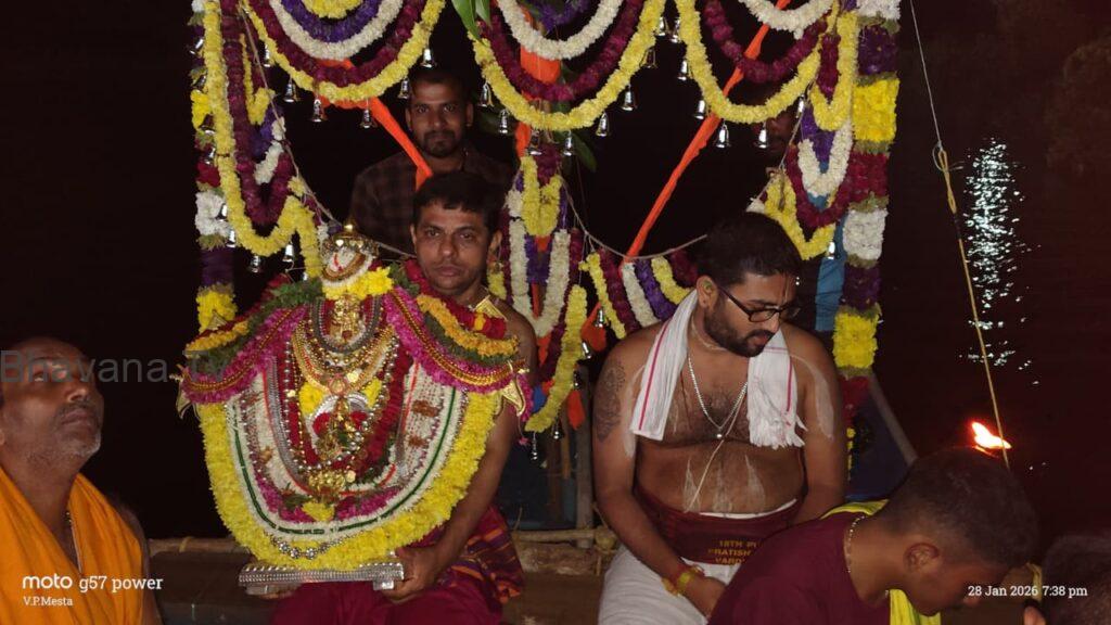 ಪವಿತ್ರ ನದಿಯಲ್ಲಿ ದೀಪಾಲಂಕೃತ ದೋಣಿಯಲ್ಲಿ ಸಾಗಿದ ದೇವರ ದರ್ಶನ ಪಡೆಯಲು ಸುತ್ತಮುತ್ತಲಿನ ಗ್ರಾಮಸ್ಥರು ಹೆಚ್ಚಿನ ಸಂಖ್ಯೆಯಲ್ಲಿ ಆಗಮಿಸಿ ದೈವಕೃಪೆಗೆ ಪಾತ್ರರಾದರು.