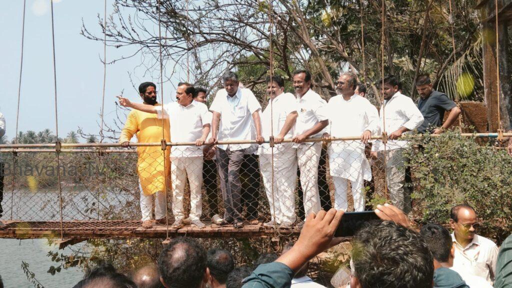 ಹೊನ್ನಾವರ : ಮುರಿದು ಬೀಳುವ ಹಂತದಲ್ಲಿದ್ದ ತಾಲೂಕಿನ ಕರ್ಕಿಯ ಪಾವಿನಕುರ್ವಾದ ತೂಗು ಸೇತುವೆ ವೀಕ್ಷಣೆ ಮಾಡಿದ ಲೋಕೋಪಯೋಗಿ ಸಚಿವ ಸತೀಶ ಜಾರಕಿಹೊಳಿ ಹೊಸ ಸೇತುವೆ ನಿರ್ಮಾಣ ಮಾಡುವ ಗ್ರಾಮಸ್ಥರ ಸಮಸ್ಯೆ ಆಲಿಸಿದರು.