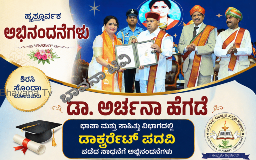 ಶಿರಸಿ: ತಾಲೂಕಿನ ಸೋಂದಾ ಮೂಲದ ಅರ್ಚನಾ ಹೆಗಡೆ ಅವರು ಬೆಂಗಳೂರಿನ ಕರ್ನಾಟಕ ಸಂಸ್ಕೃತ ವಿಶ್ವವಿದ್ಯಾಲಯದಿಂದ ಭಾಷಾ ಮತ್ತು ಸಾಹಿತ್ಯ ವಿಭಾಗದಲ್ಲಿ ಡಾಕ್ಟರೇಟ್ ಪದವಿಯನ್ನು ಪಡೆದಿದ್ದಾರೆ.