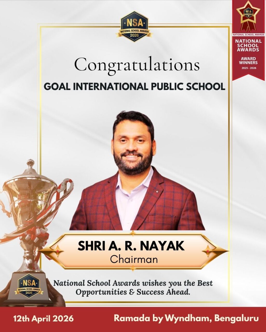 ರಾಷ್ಟ್ರೀಯ ಶಾಲಾ ಪ್ರಶಸ್ತಿಗಳ (NSA) ಬ್ಯಾನರ್ ಅಡಿಯಲ್ಲಿ ಬೆಂಗಳೂರಿನ ಯಲಹಂಕದ ವಿಂಧಮ್ನ ಹೋಟೆಲ್ ರಾಮಡಾದಲ್ಲಿ ನಡೆದ ಭವ್ಯ ಸಮಾರಂಭದಲ್ಲಿ ಪ್ರಶಸ್ತಿಯನ್ನು ಪ್ರದಾನ ಮಾಡಲಾಯಿತು. ಈ ಮನ್ನಣೆಯು ಸಮಗ್ರ ಶಿಕ್ಷಣಕ್ಕೆ ಶಾಲೆಯ ಸ್ಥಿರವಾದ ಬದ್ಧತೆಯನ್ನು ಎತ್ತಿ ತೋರಿಸುತ್ತದೆ, ಶೈಕ್ಷಣಿಕ ಶ್ರೇಷ್ಠತೆ, ಸಹಪಠ್ಯ ಚಟುವಟಿಕೆಗಳು ಮತ್ತು ವಿದ್ಯಾರ್ಥಿಗಳ ಒಟ್ಟಾರೆ ವ್ಯಕ್ತಿತ್ವ ಬೆಳವಣಿಗೆಯ ಮೇಲೆ ಕೇಂದ್ರೀಕರಿಸುತ್ತದೆ.