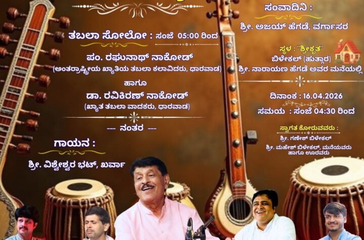 ಸಿದ್ದಾಪುರ: ಸಿದ್ದಾಪುರ ತಾಲೂಕಿನ (ಹುತ್ಗಾರ) ಬಿಳೇಕಲ್ನ ನಾರಾಯಣ ಹೆಗಡೆ ಅವರ ಮನೆ ಅಂಗಳದಲ್ಲಿ ಏ. 16ರಂದು "ಶ್ರೀಕೃತ" ನಾದೋಪಚಾರ ಎಂಬ ವಿಶೇಷ ಸಂಗೀತ ಕಾರ್ಯಕ್ರಮವನ್ನು ಆಯೋಜಿಸಲಾಗಿದೆ.ಅಂದು ಸಂಜೆ...